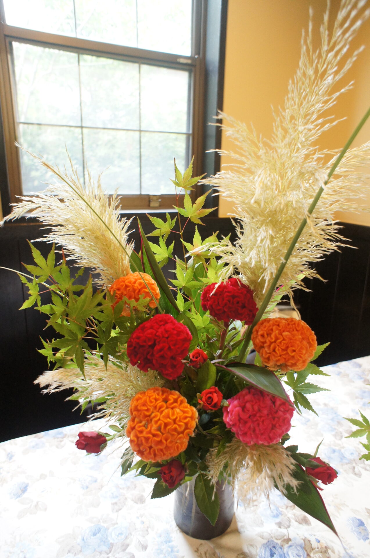 鶏頭・薔薇・バンパス・紅葉・ドラセナ